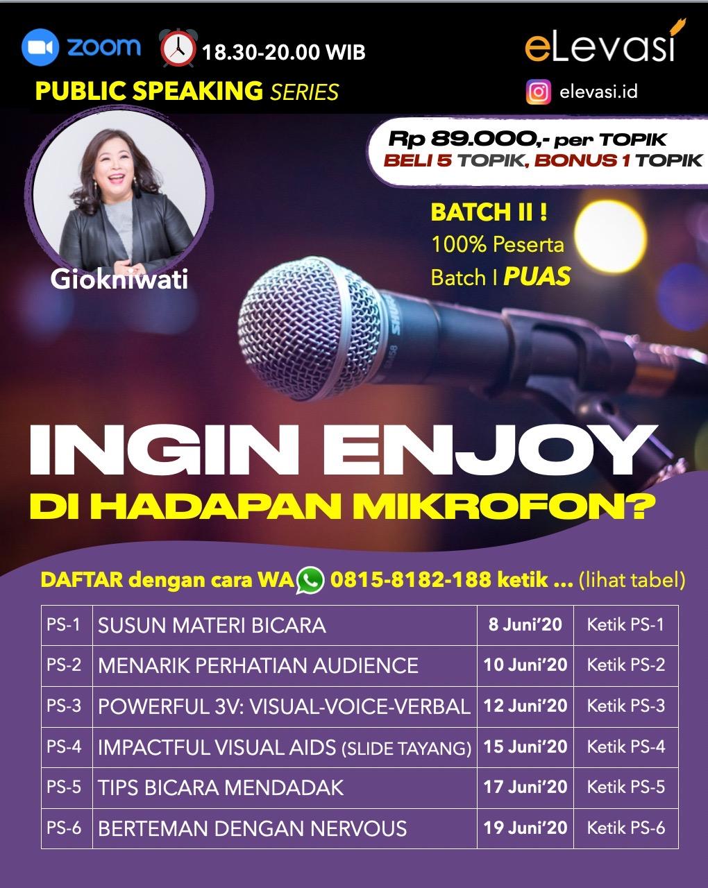 PS1. Susun Materi Bicara - 8 Juni 2020 PS2. Menarik Perhatian Audience - 10 Juni 2020 PS3. Powerful 3V: Visual - Voice - Verbal - 12 Juni 2020 PS4. Impactful Visual Aids (Slide Tayang) - 15 Juni 2020 PS5. Tips Bicara Mendadak - 17 Juni 2020 PS6. Berteman Dengan Nervous - 19 Juni 2020